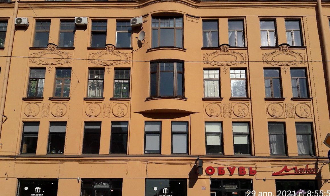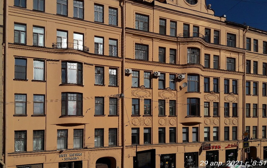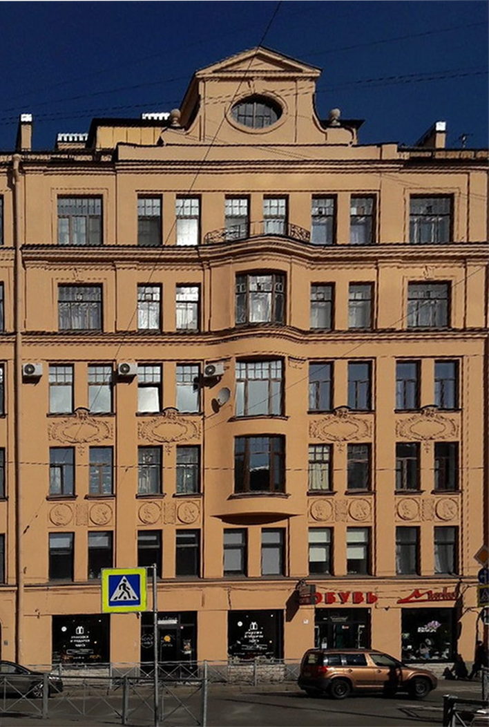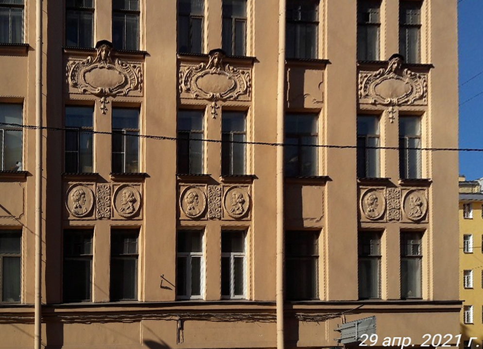 "Шестиэтажное здание, первый этаж которого предназначен для размещения лавок и магазинов. На уровне третьего - пятого этажей на центральном и боковых фасадах находятся эркеры, завершающиеся небольшими балконами с ажурными решётками. Гладкий фасад чётко делится пилястрами, между которыми располагаются по два окна. Портал оформлен в виде полукруглой арки. В центре дома, на крыше, находится небольшая башенка с фронтоном. Фасад дома между вторым и третьим этажами украшен многочисленными медальонами с мужскими и женскими портретами.