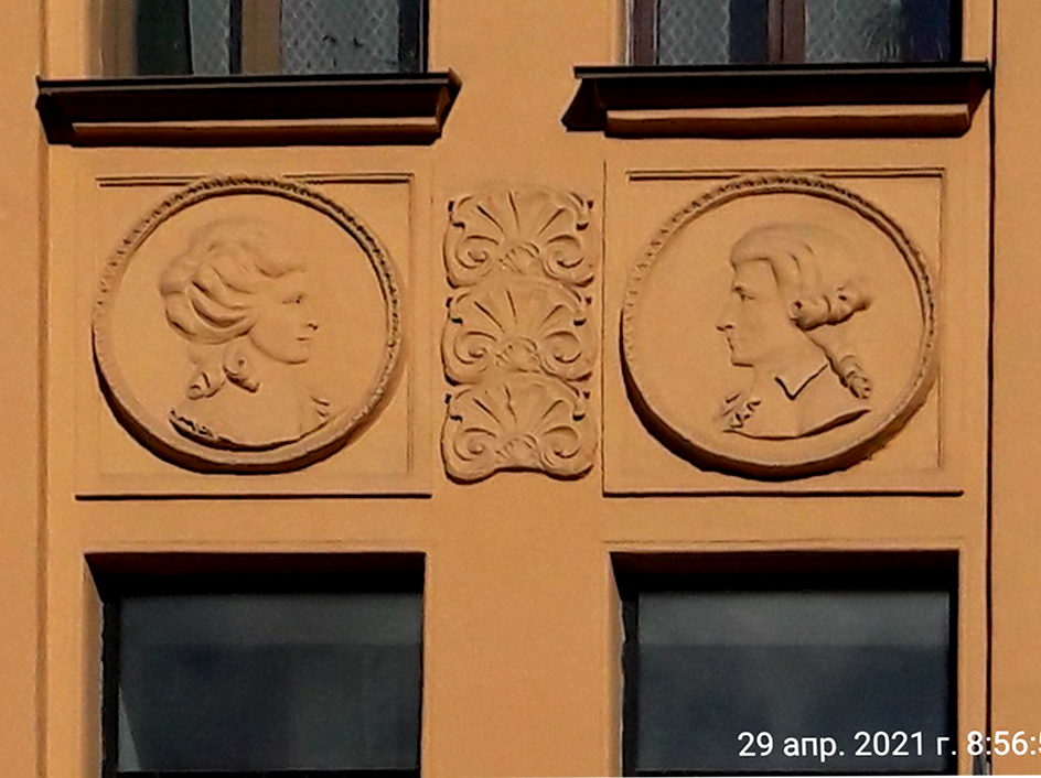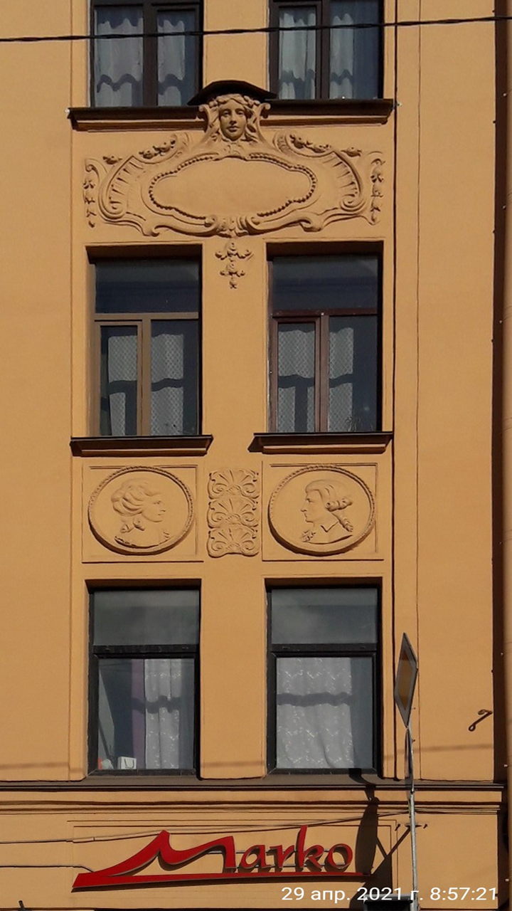 В то время как фасад дома создан по законам модерна, парадная дома напоминает типичный неоклассицизм. Точно такие же колонны и барельефы можно наблюдать в собственном доме архитектора Лишневского на ул. Ленина." ФёдорГрибков