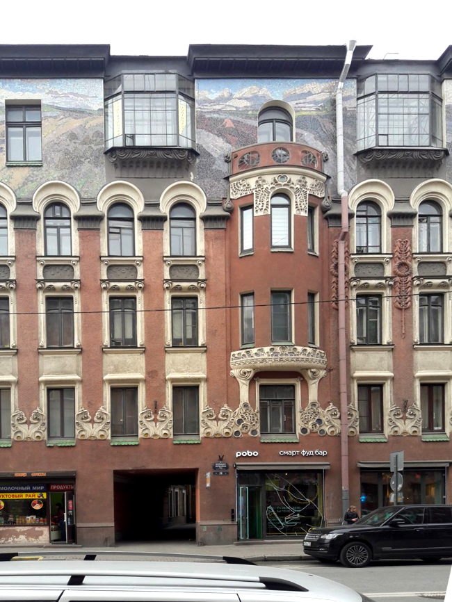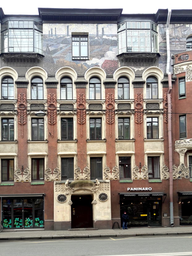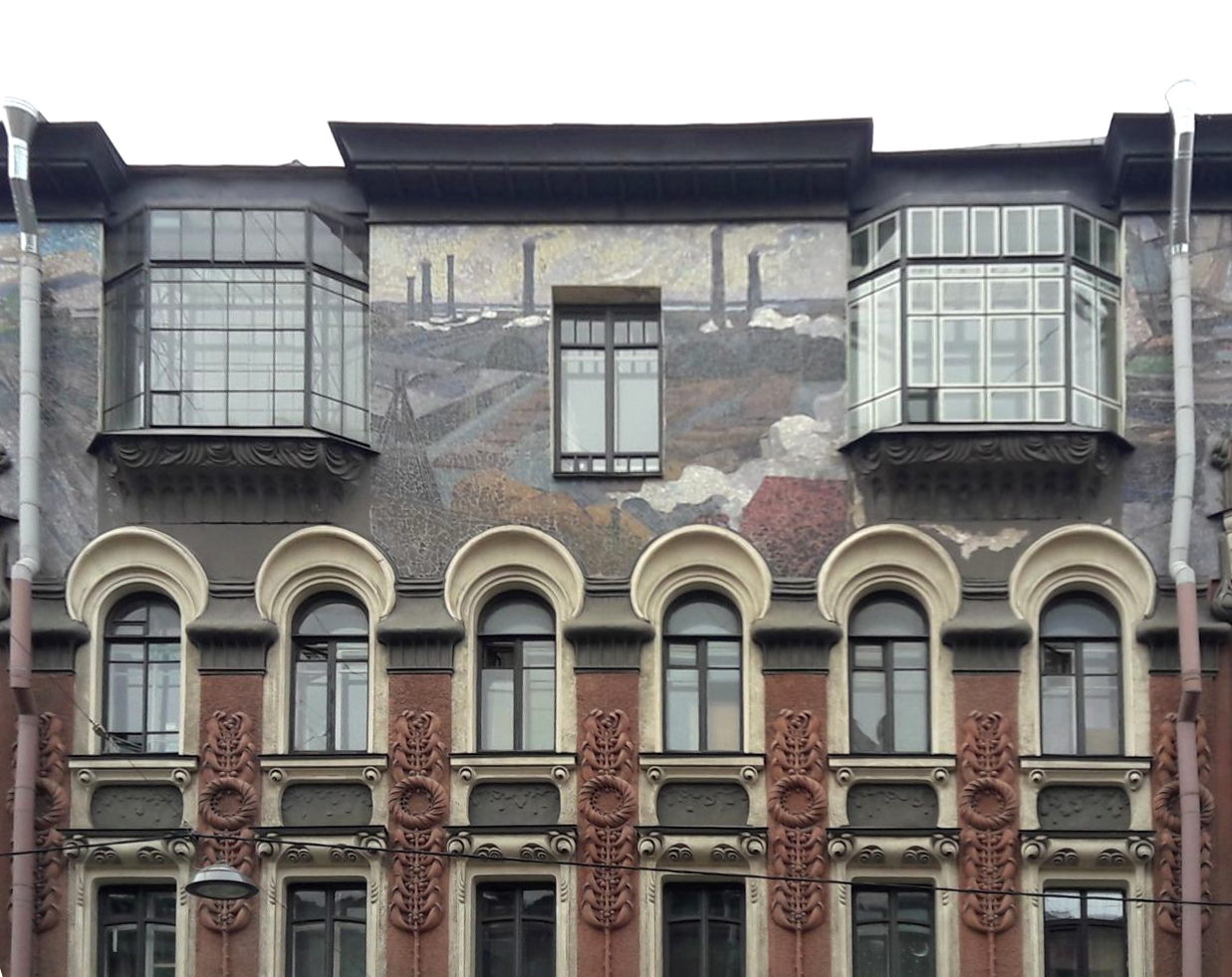 Доминантой главного фасада является огромный мозаичный фриз, состоящий из пяти больших мозаичных панно, созданных в 1905 г. по эскизам художника С. Т. Шелкового в мастерской В. А. Фролова. По замыслу художника, мозаика расположена между большими окнами пятого этажа и фактически покрывает всю стену здания. Впервые на здании был изображен пейзаж - поля, холмы, река, городские здания, индустриальный пейзаж с высокими дымящимися трубами. Мотивы плавно перетекают один в другой, создавая панораму. На панно с изображением парусников справа внизу буква «Ф» и год «1905».
