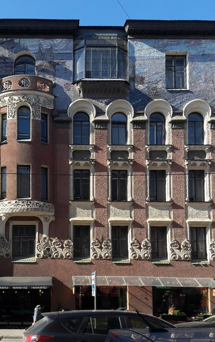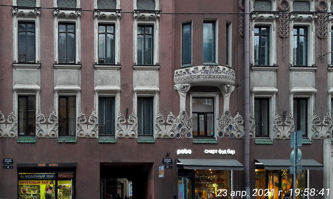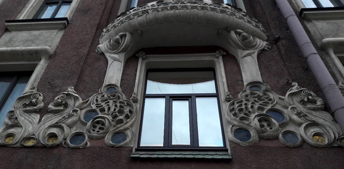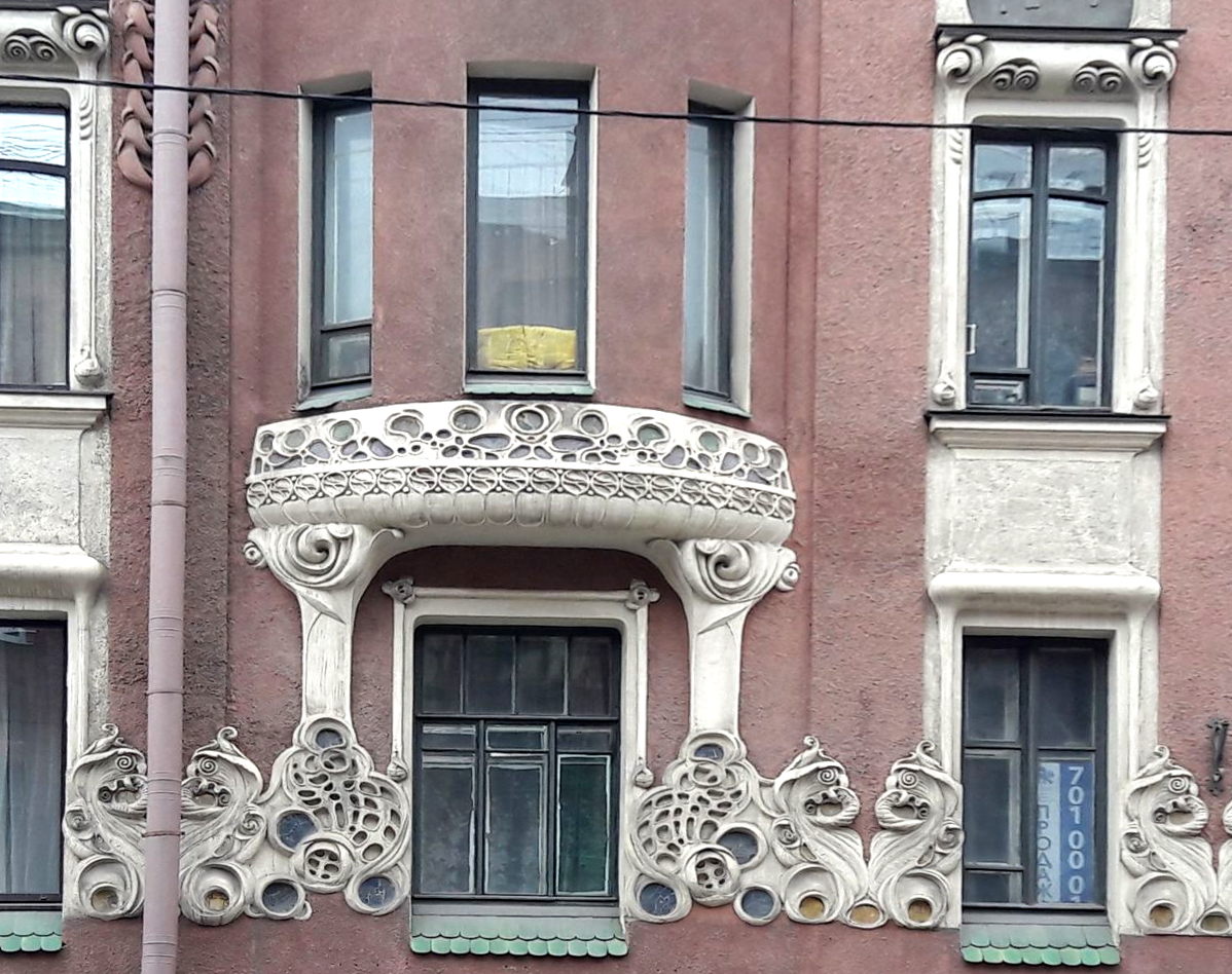 Три жилых этажа «прорезаны» высокими окнами, объединены пилястрами и двумя округлыми эркерами. На уровне второго этажа проходит пояс из причудливо сплетающихся полос и зигзагообразных фигур. Рельефный декор дома поражает затейливым своеобразием.